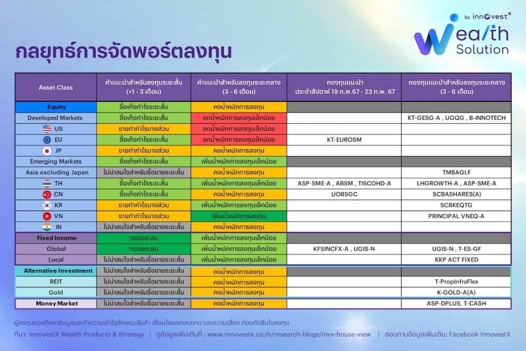 ดังนั้นการเลือกลงทุนและ การจัดพอร์ต(Asset Allocation) ให้เหมาะสมกับสภาวะตลาดและเศรษฐกิจ เป็นเรื่องที่สำคัญอย่างมาก ด้วยเหตุนี้เราจึงได้ พัฒนาโซลูชันด้านการลงทุน รูปแบบใหม่ “InnovestX Wealth Solution” ชู 3 จุดเด่น “1. คัดกองทุนแกร่ง 2. พร้อมคัด คำแนะนำการลงทุนที่เหมาะสมในแต่ละช่วงเวลา เพื่อตอบโจทย์นักลงทุนแต่ละกลุ่ม และ 3. คัดของดีราคาคุ้ม ด้วยดีลสุดเอ็กซ์คลูซีฟ”