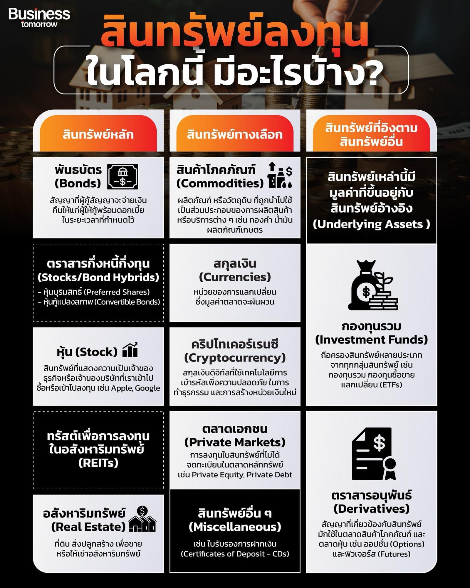 ภาพนี้ได้รวบรวมประเภทของสินทรัพย์ที่เป็นที่นิยมในการลงทุน ซึ่งสามารถแบ่งออกเป็น 3 กลุ่มใหญ่ๆ ได้แก่